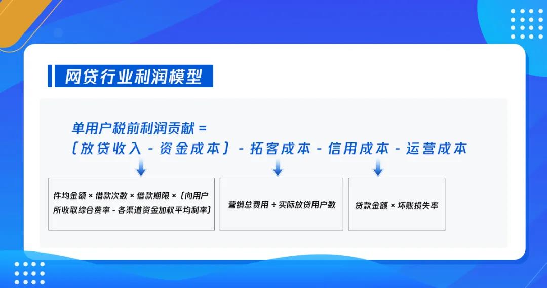理解网贷行业的利润模型,有助于理解广告主的业务模式,把握考核重心。由于资金成本和运营成本相对固定,拓客成本和信用成本是决定网贷行业利润空间的关键变量。服务商需要从人群洞察精细化和流量运营精细化入手,提升高资质人群的拿量能力,帮助广告主控制成本,提升投放效率。