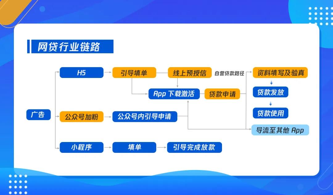 网贷行业广告投放需要以H5填单转App下载链路为基础,具备较强技术能力的广告主可进一步尝试H5预授信链路,配合公众号加粉链路,加倍提升投放效果。