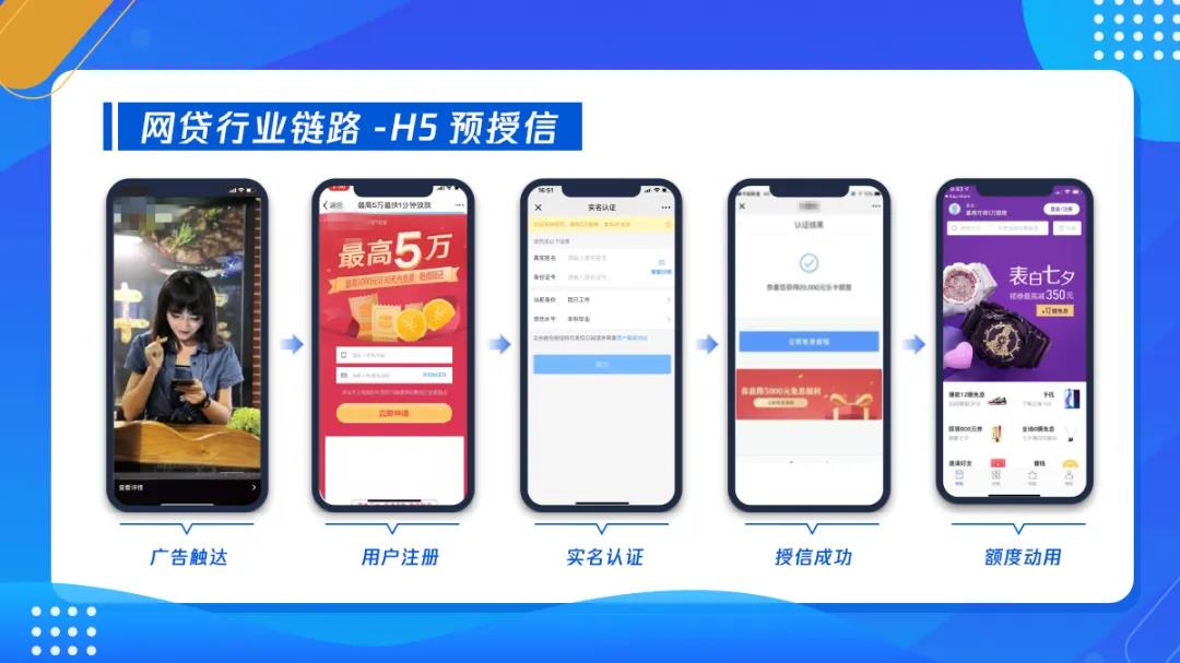 · H5预授信链路中,用户在落地页填写简单资料,进行实名认证后获得预授信,方便快捷,成本达成和跑量效果出色,对广告主的技术能力要求较高。