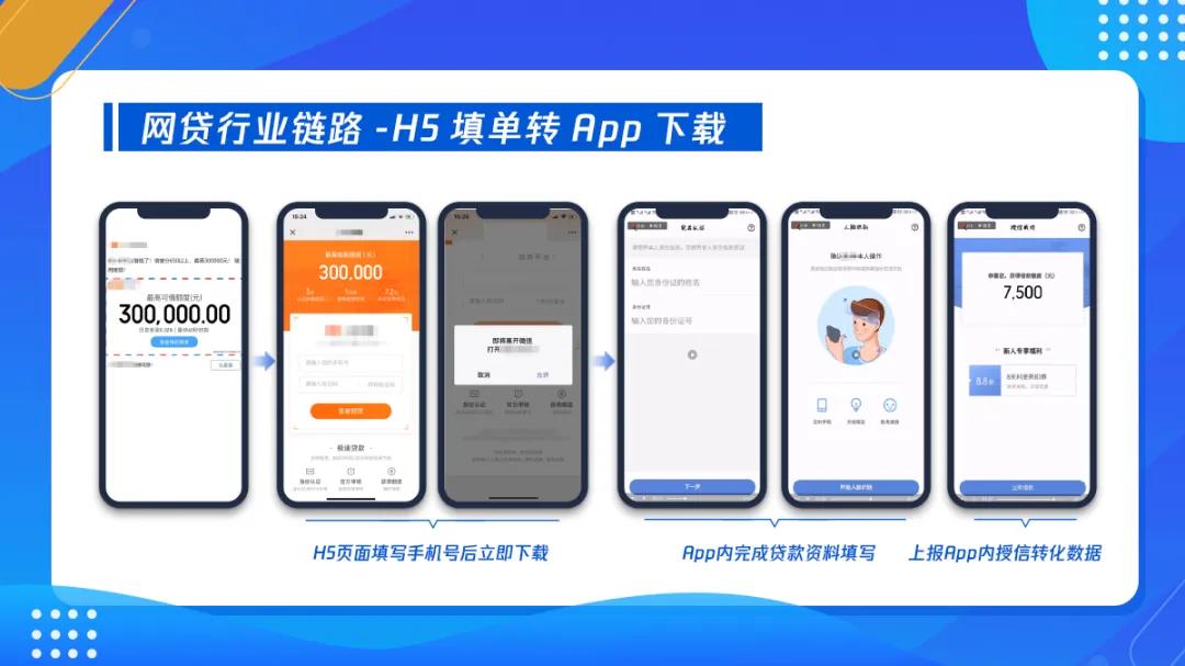 · H5填单转App下载是网贷行业的基础标配链路,用户在App内完成贷款申请资料填写,满足广告主对App下载/激活的转化需求。