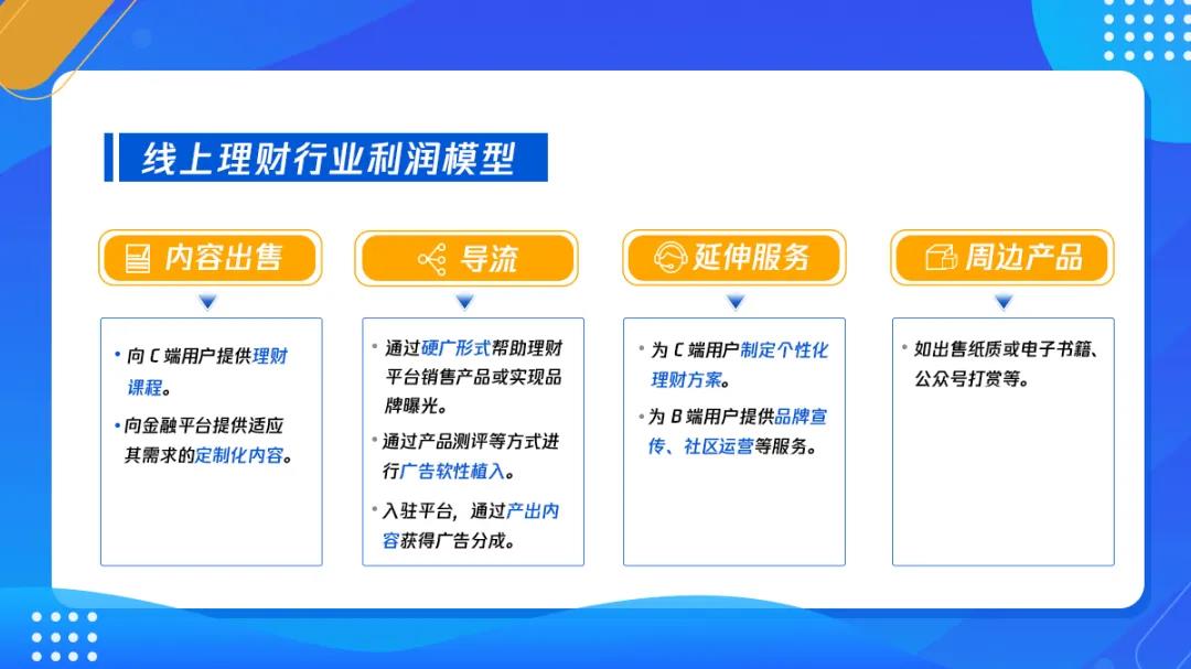 以线上综合理财和财商教育平台为代表的线上理财赛道进入快速发展期,客群广、多SKU的行业特征暗含着极大的发展潜力,服务商需要提升素材竞争力,抢先进行消费者教育。