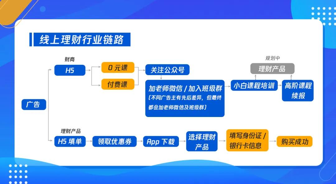 线上理财行业利润来源丰富,有内容出售、导流、延伸服务、周边产品等多种业务发展方向,能够覆盖不同年龄段、具备不同理财需求的用户。在效果考核中,财商类广告主主要关注0元/付费课拓客成本、加班成本和高阶课拓客成本,理财平台类广告主则重点关注入金成本和入金金额。