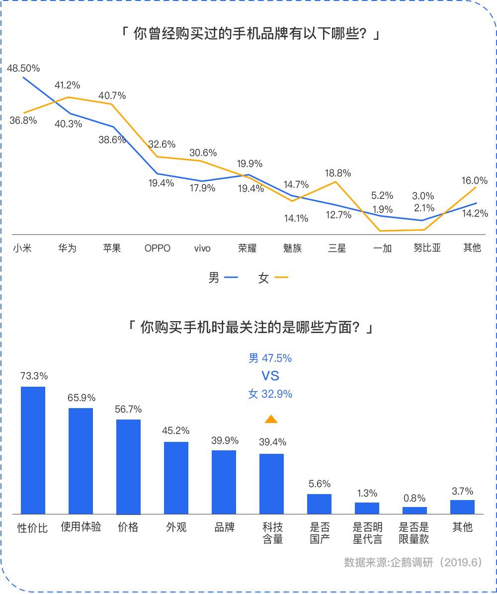 在QQ空间动态中,18-25岁的Z世代,无论男女,苹果都是手机品类中最具话题性的品牌。小米在18-25岁Z世代女性有着第二高的讨论度,仅次于苹果;但在18-25岁男性群体中,小米被提及的频率反而被华为和三星赶超。而在实际消费中,小米、华为、苹果是Z世代最青睐的“铁三角”,购买比例均位居前三。48.5%Z世代男性曾购买过小米品牌的手机,而OPPO、vivo、三星品牌则对Z世代女性更具备吸引力。超过半数的Z世代使用的手机价位在1000-3000元间,拥有5000元以上手机的消费者占比高达17.7%,仅3%在使用低于1000元的手机。