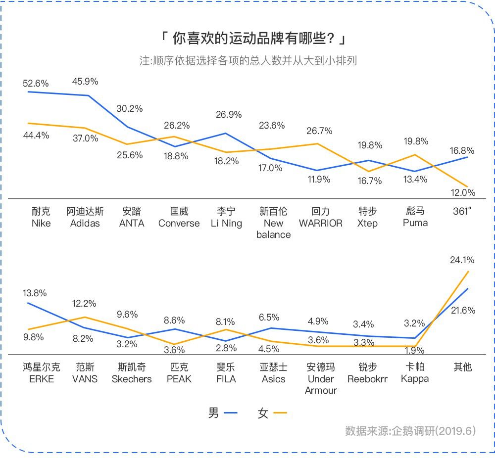 许多国产品牌也在Z世代中收获良好的口碑,安踏、李宁、回力、特步、361°均位居讨论度前十,其中安踏更排名第三,受27.8%Z世代喜爱。