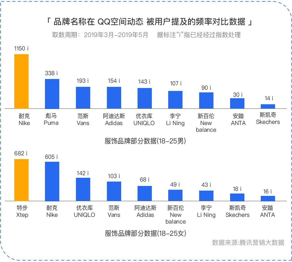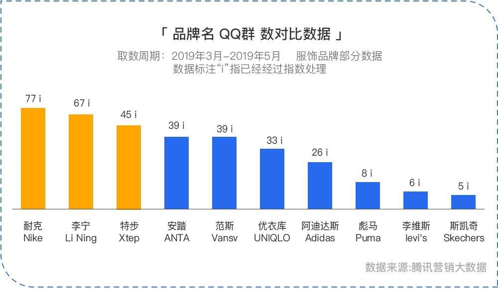 耐克、李宁、特步三个品牌的关键词在QQ群名中有涉及到的数目居于前列。
