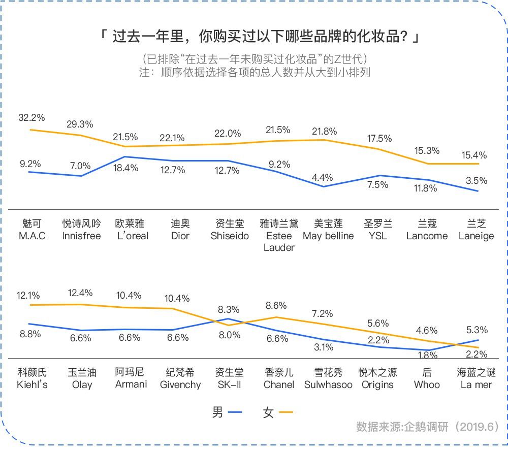 Z世代的化妆品消费:魅可、悦诗风吟、欧莱雅购买率排名前三。过去一年中,各有30%左右的Z世代女性对魅可、悦诗风吟这两个品牌有过消费,她们对欧莱雅、迪奥、资生堂、雅诗兰黛、美宝莲的消费比例也均达到两成以上。Z世代男性购买最多的三个化妆品品牌是:欧莱雅、迪奥、资生堂。其中欧莱雅达18.4%,领先其他品牌较多。