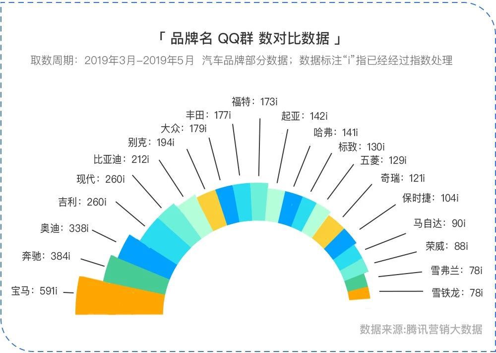 在汽车品牌中,“宝马”在QQ群名中出现的比例较高,奔驰和奥迪则相近,达“宝马”总数的一半以上。汽车品牌被用作QQ群名并引发集群式讨论的比例较高,远超服饰、化妆品类品牌。网民进行某些品类品牌的消费时,讨论社区是他们重要的种草和参考渠道。在车友群、品牌粉丝群的数量上,BBA稳坐头把交椅;吉利、比亚迪、哈弗等国产品牌在QQ平台也有较高的社交讨论。