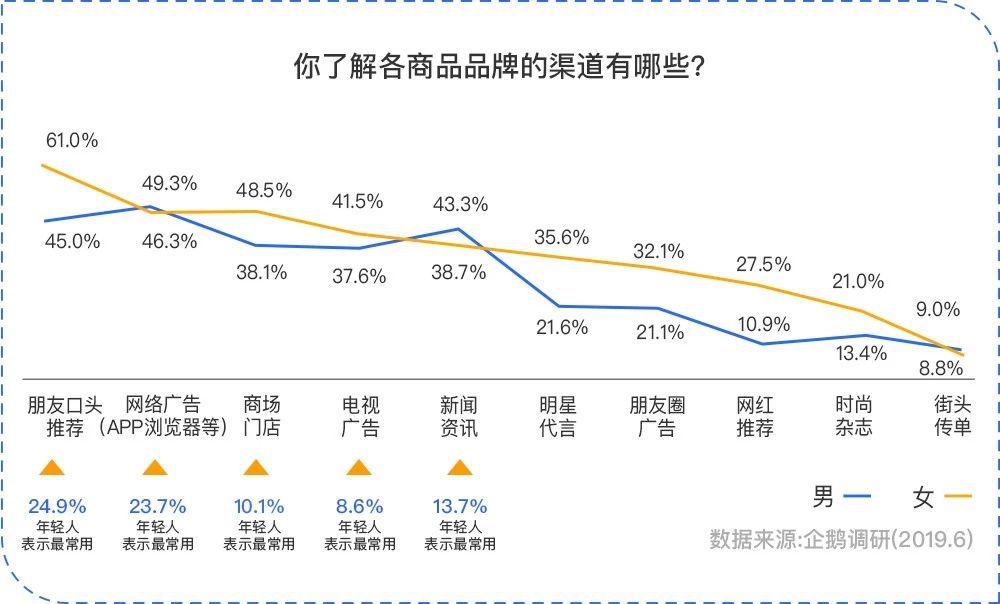 在Z世代了解商品品牌的途径中,朋友推荐与网络广告(APP、浏览器等)位居前二,二者分别是55.1%与47.4%Z世代的选择,将近25%的年轻人表示朋友口头推荐非常管用。